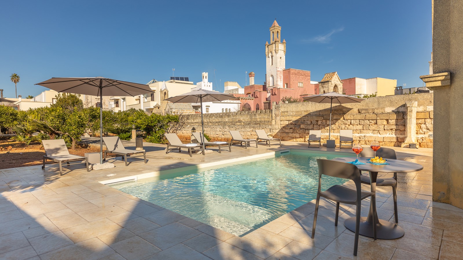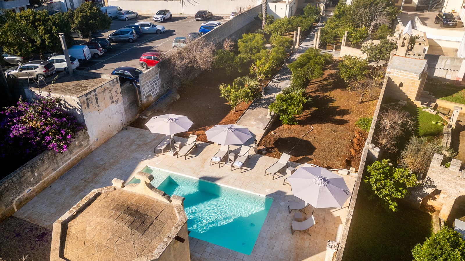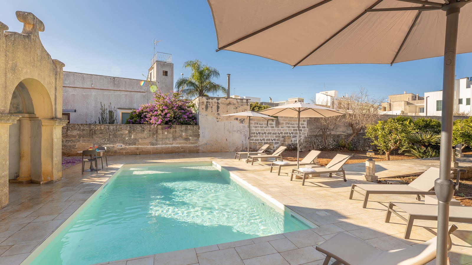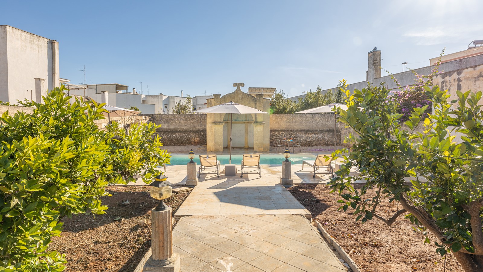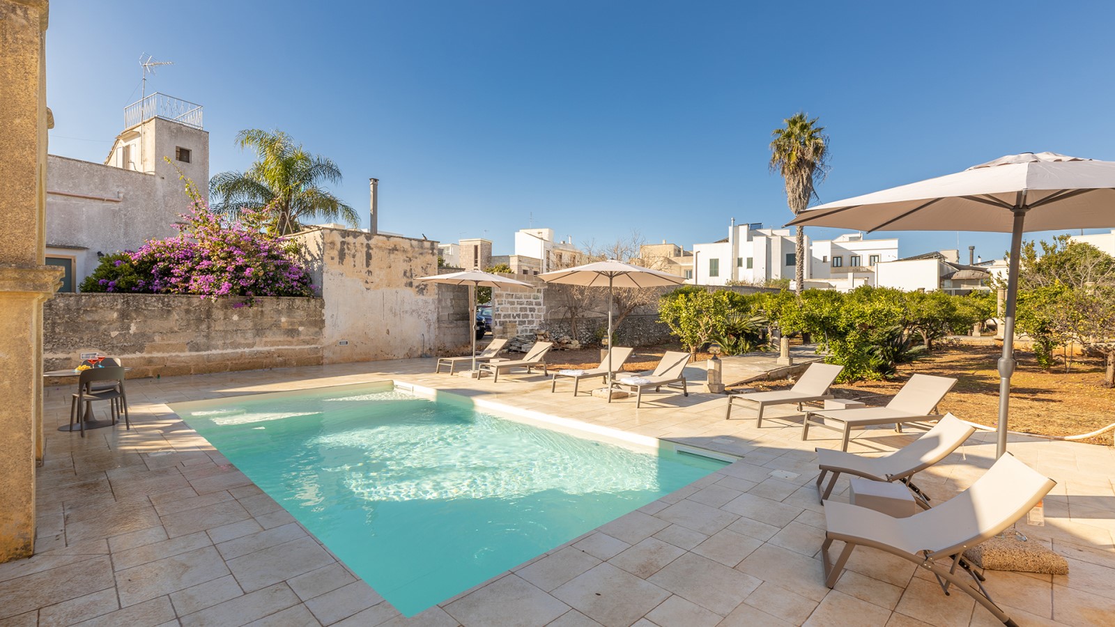 All’esterno, un giardino-agrumeto profumato conduce alla **piscina privata**, immersa nel verde. Ideale per gruppi o famiglie in cerca di privacy e comfort in un contesto esclusivo.