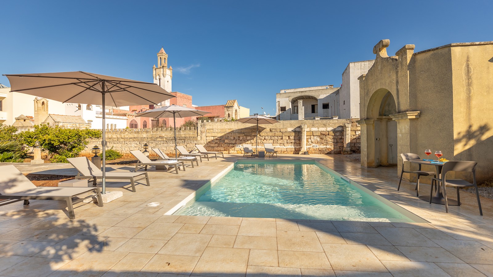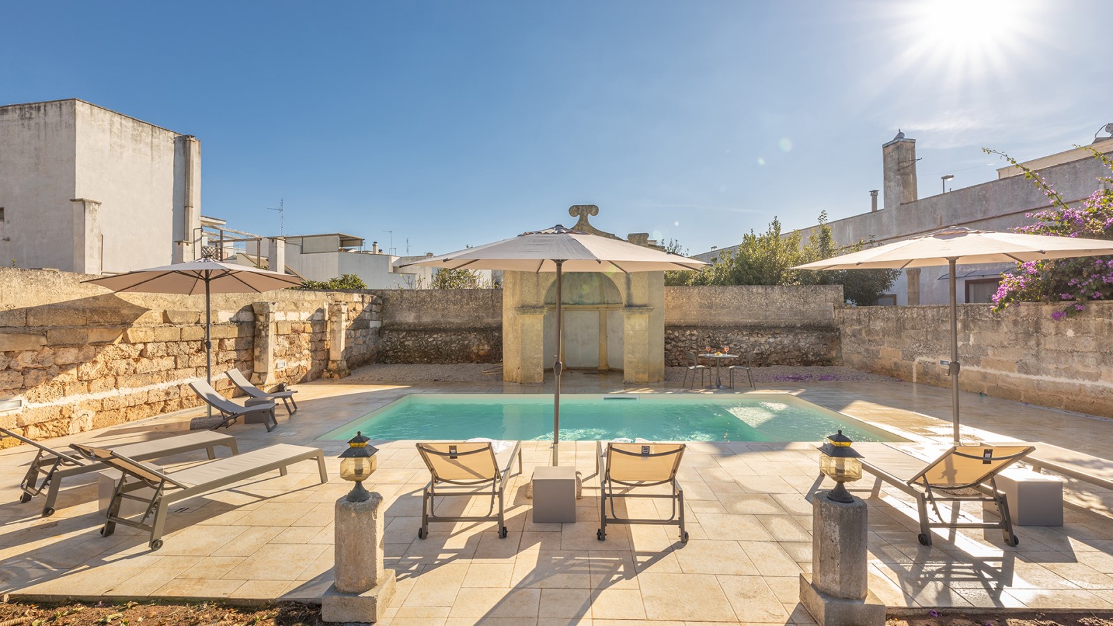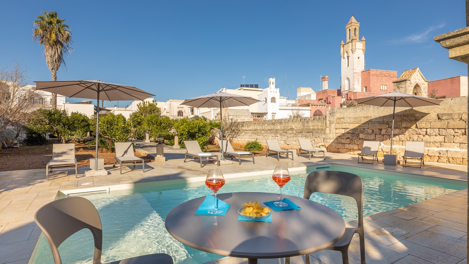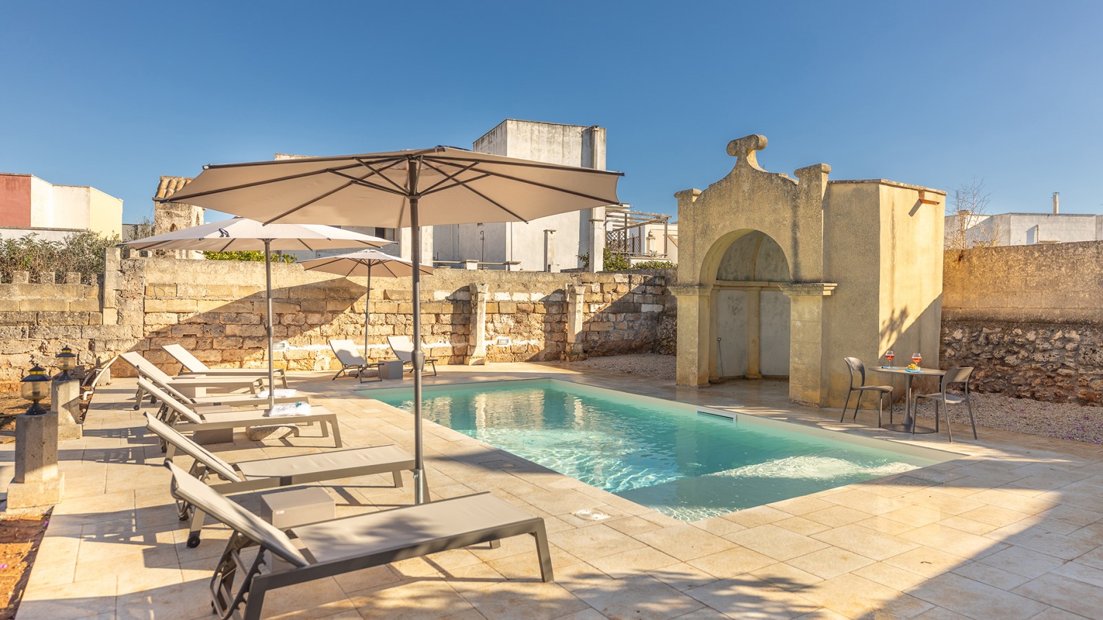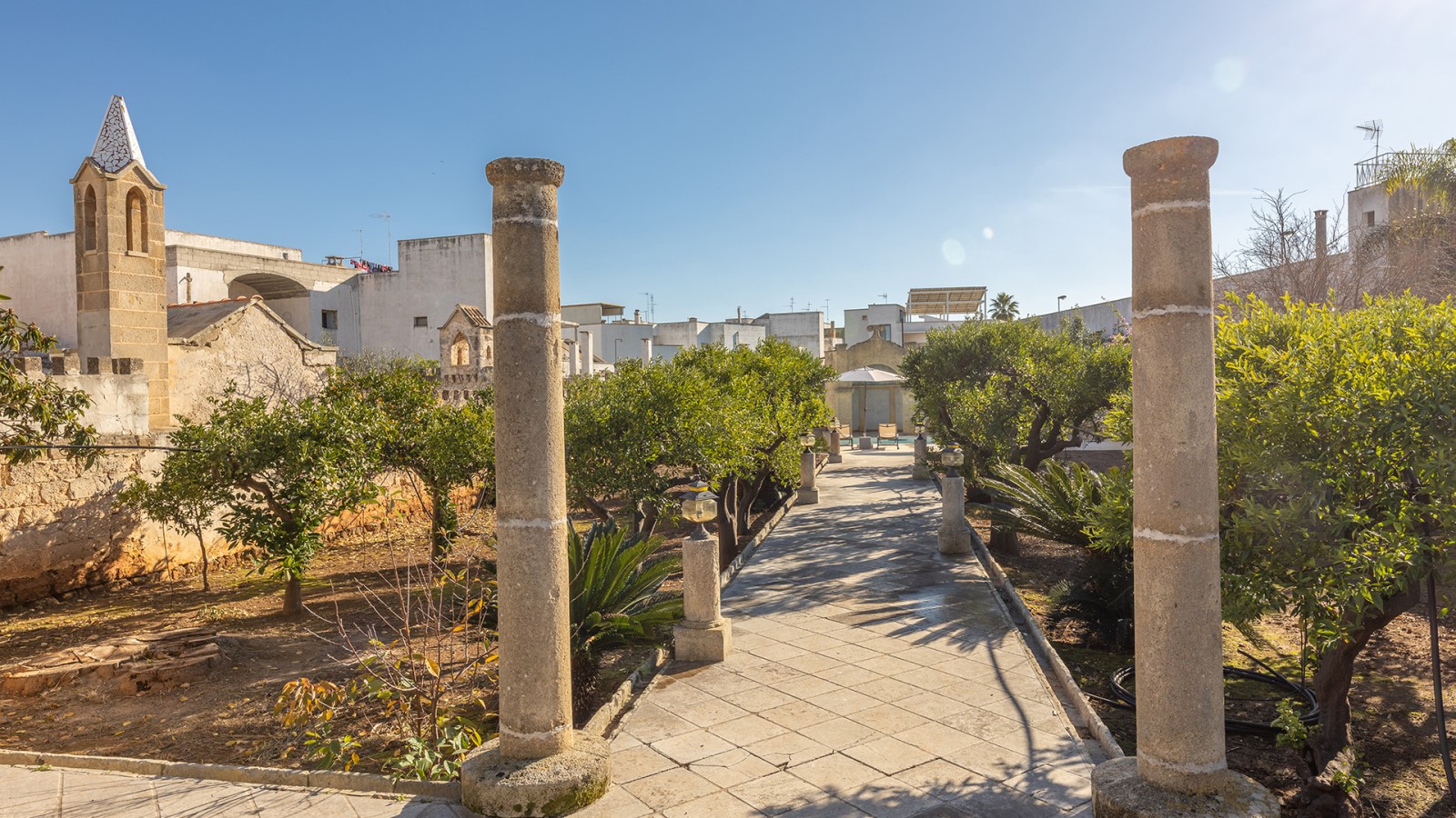 All’esterno, un giardino-agrumeto profumato conduce alla **piscina privata**, immersa nel verde. Ideale per gruppi o famiglie in cerca di privacy e comfort in un contesto esclusivo.