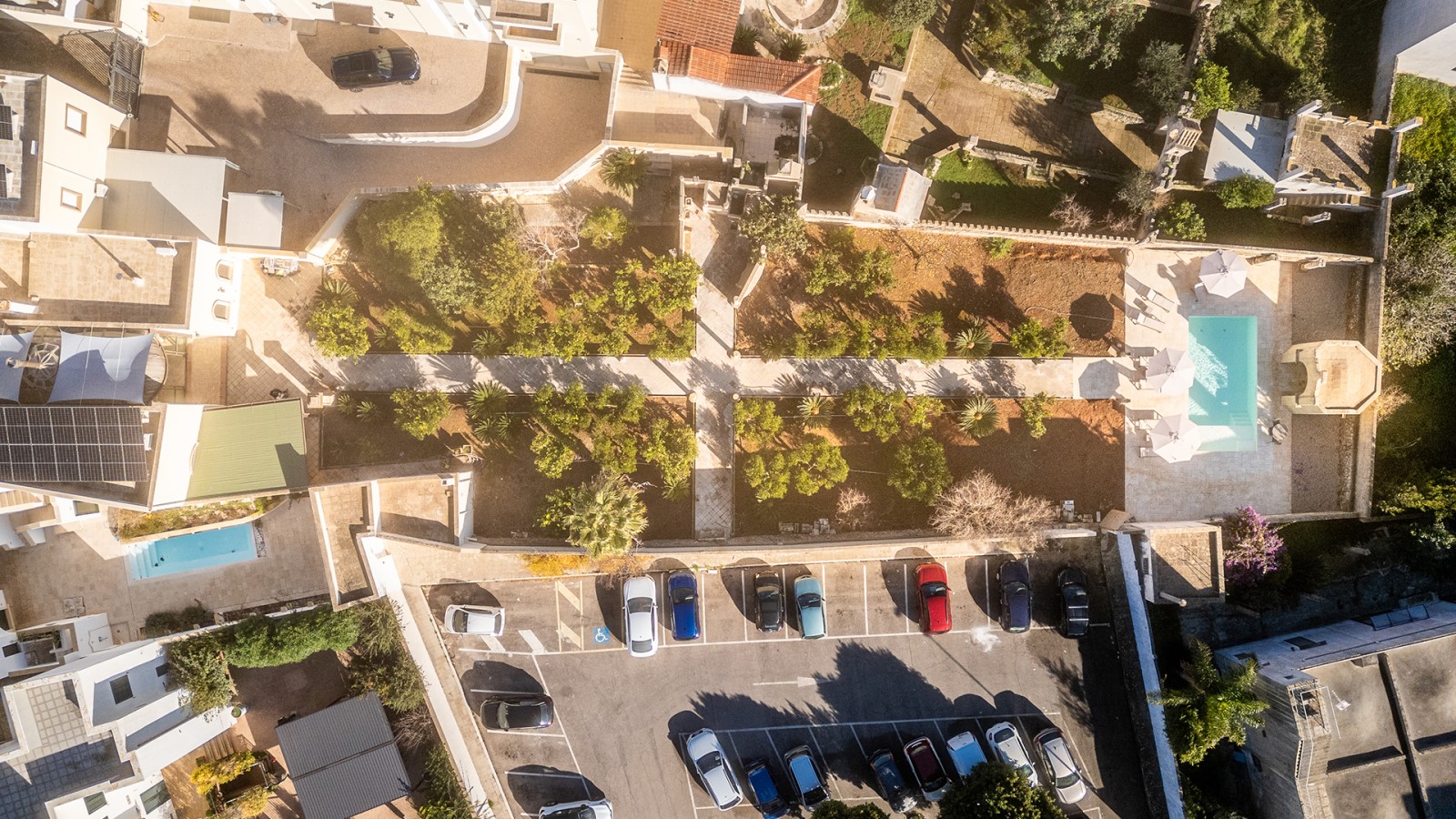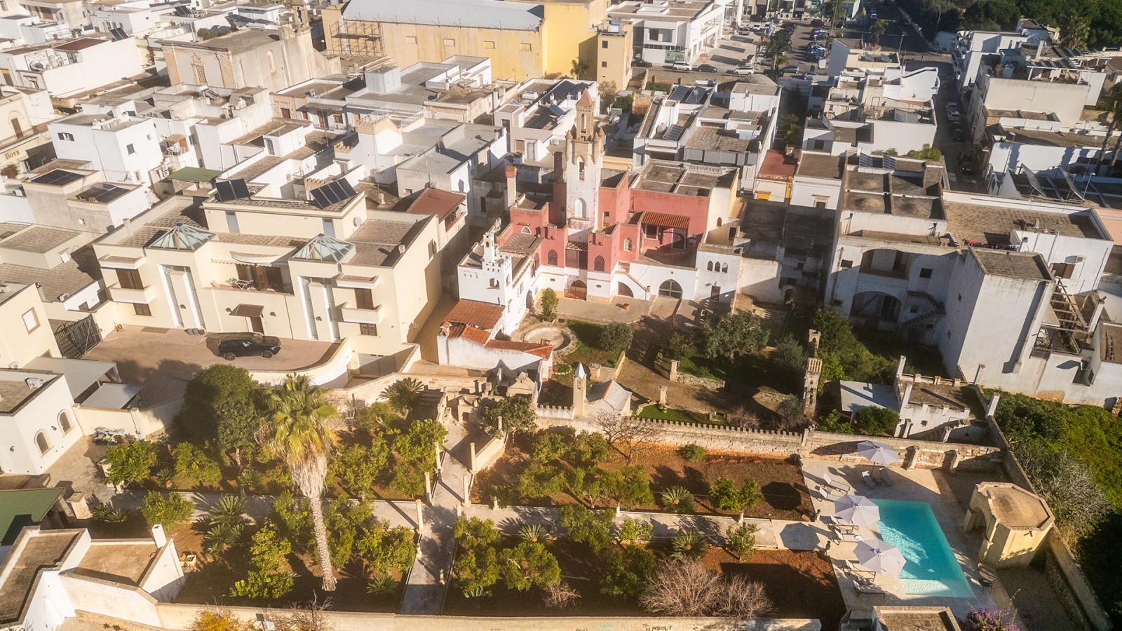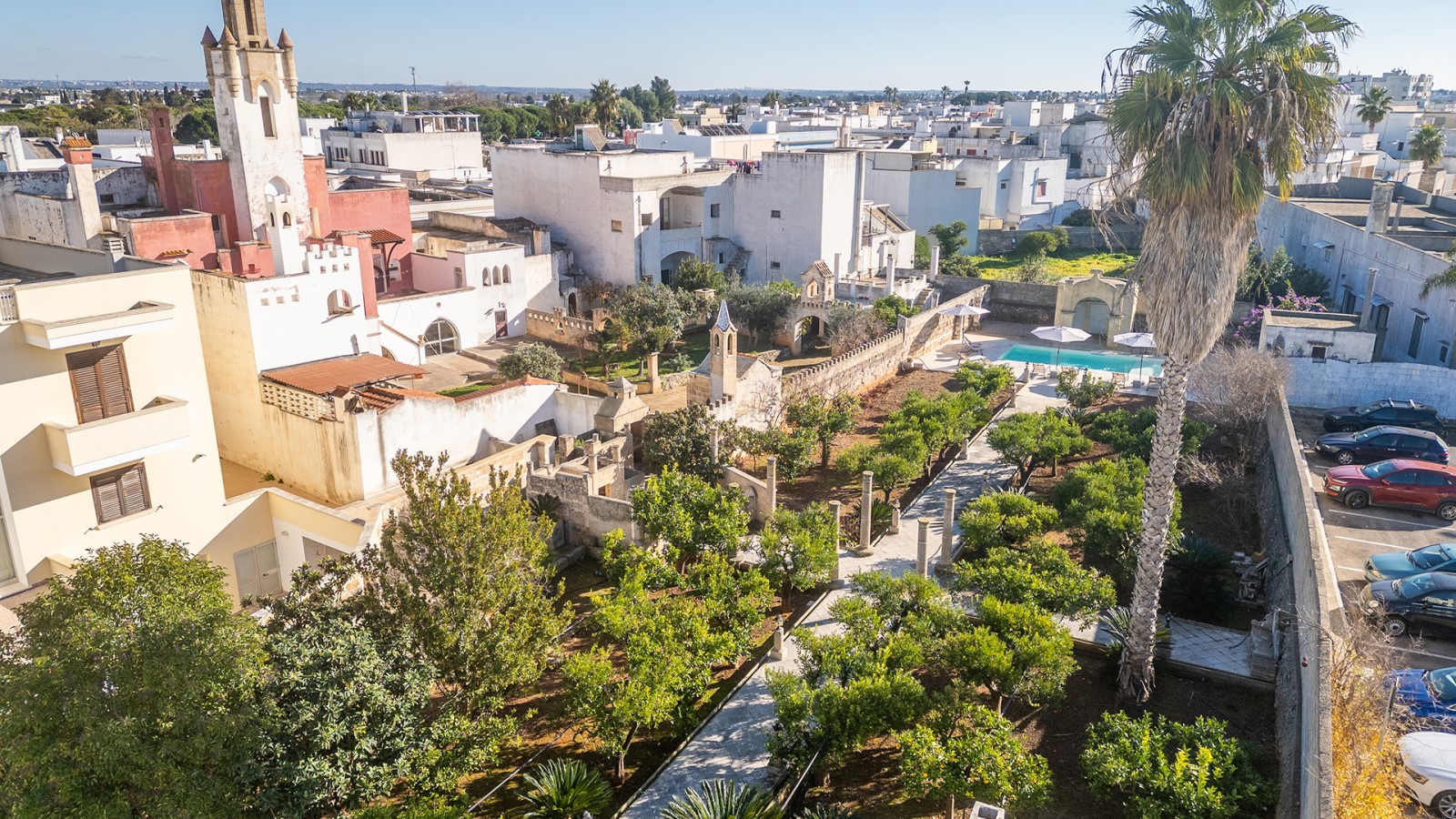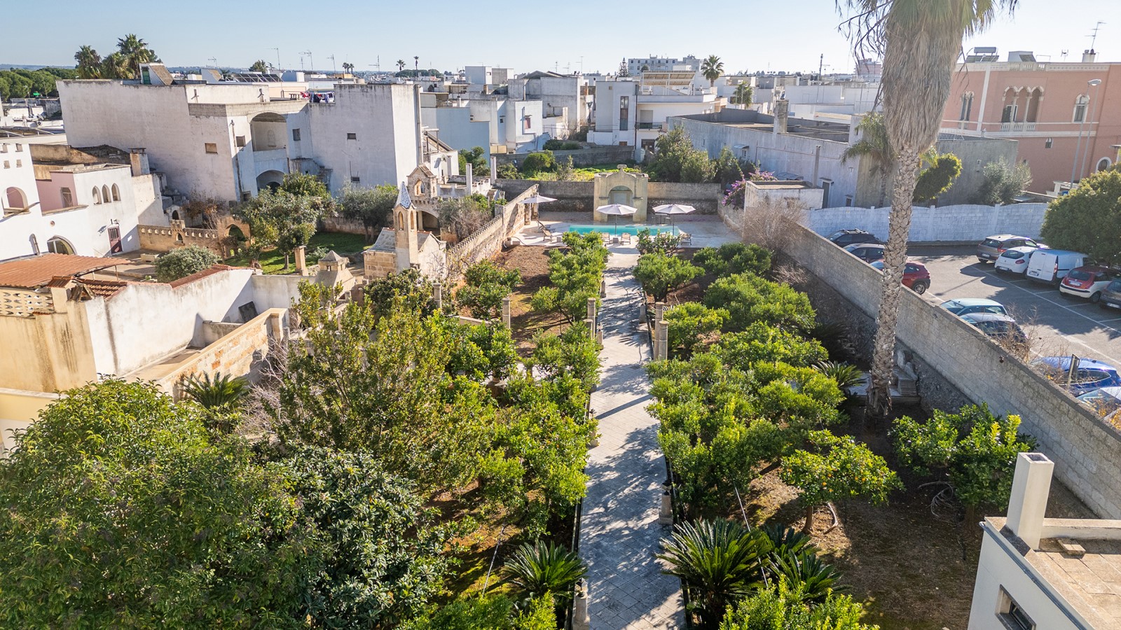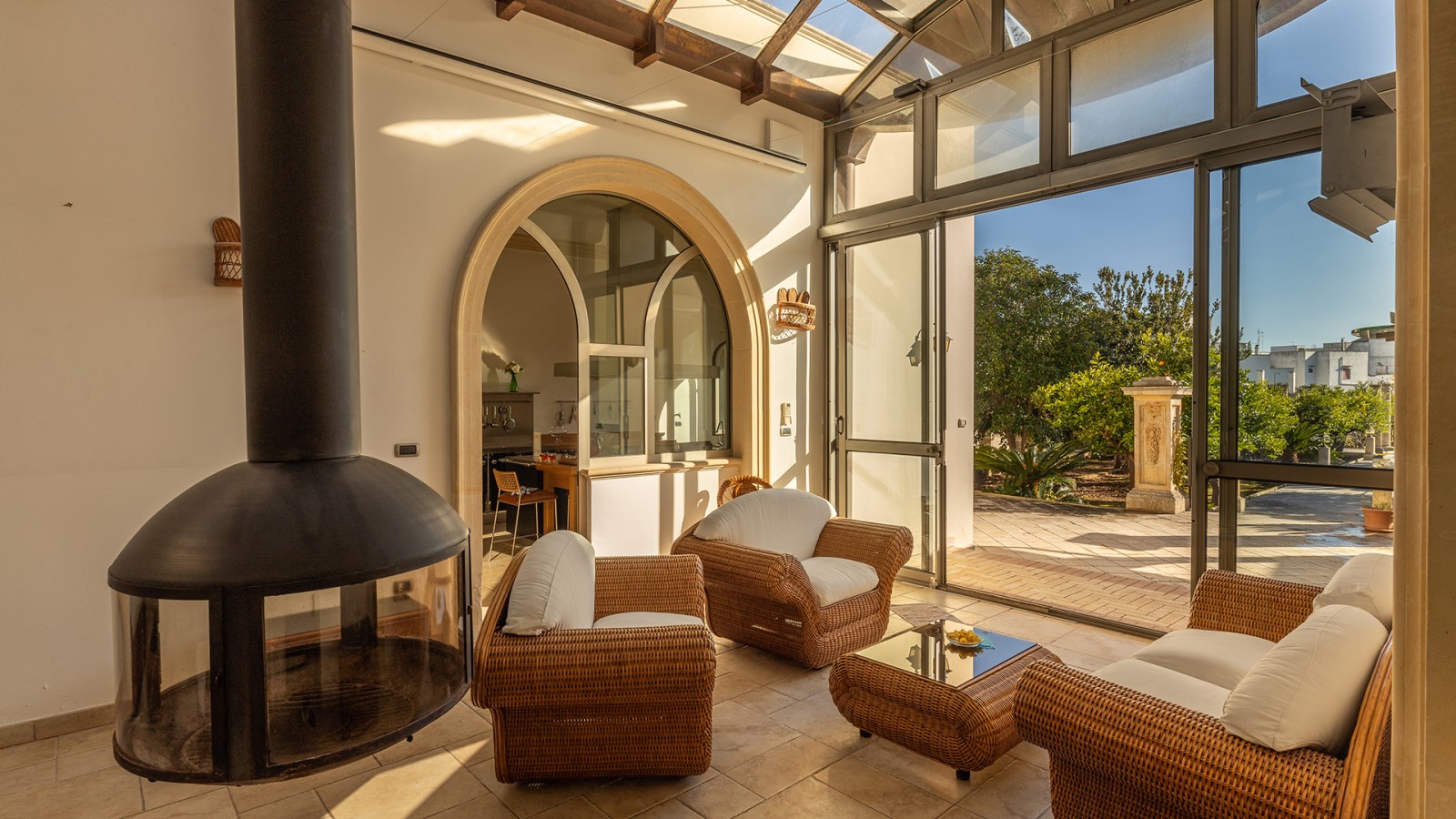 All’esterno, un giardino-agrumeto profumato conduce alla **piscina privata**, immersa nel verde. Ideale per gruppi o famiglie in cerca di privacy e comfort in un contesto esclusivo.