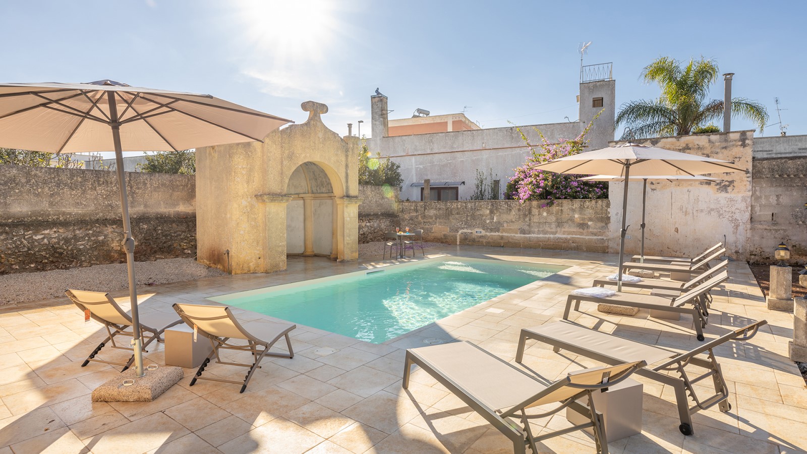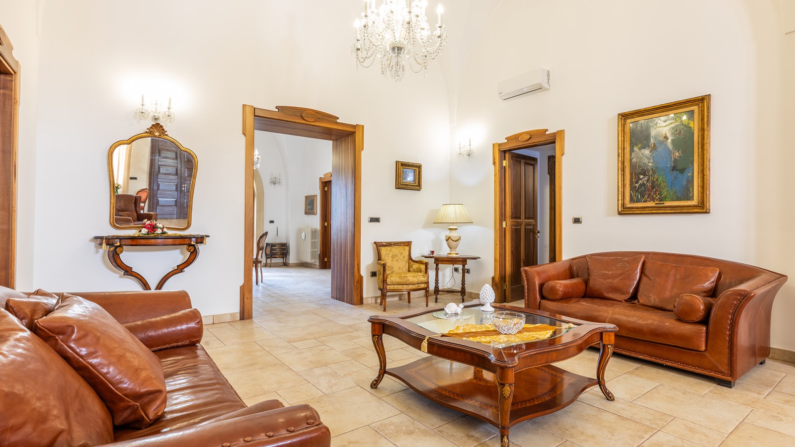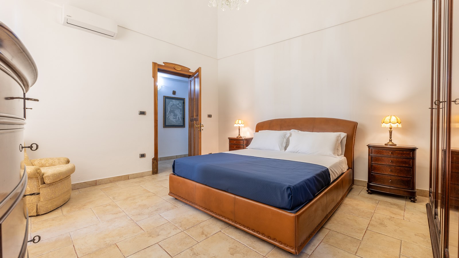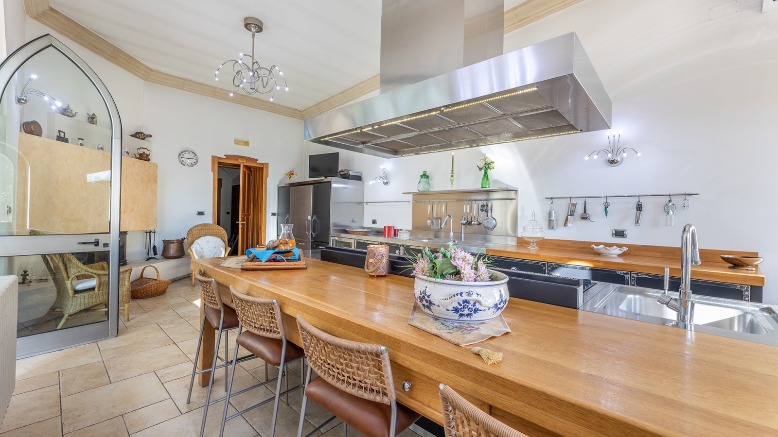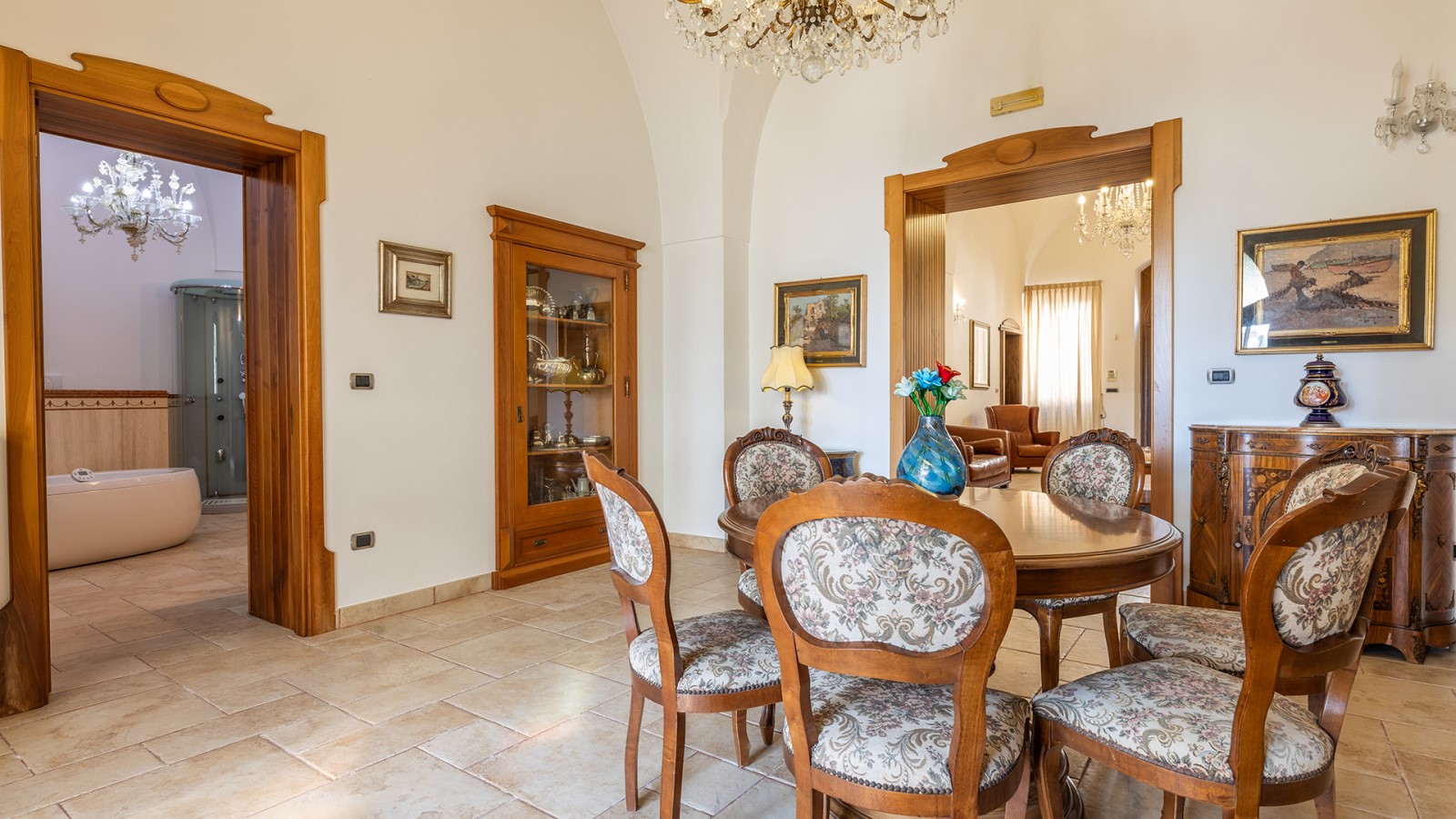 Dimora di charme con 4 camere matrimoniali, 3 bagni completi (2 ensuite), 1 bagno di servizio, ampio patio in vetro e rame, cucina professionale, zona relax con vasca idromassaggio e bagno turco. Arredi artigianali e mobili d’epoca convivono con elementi moderni e funzionali.