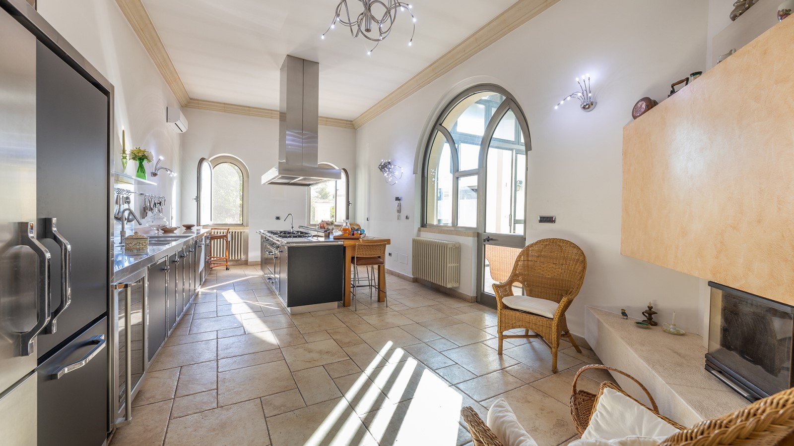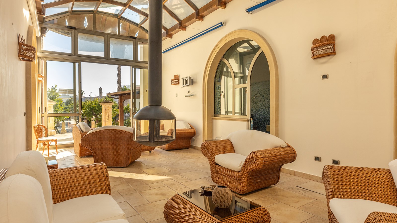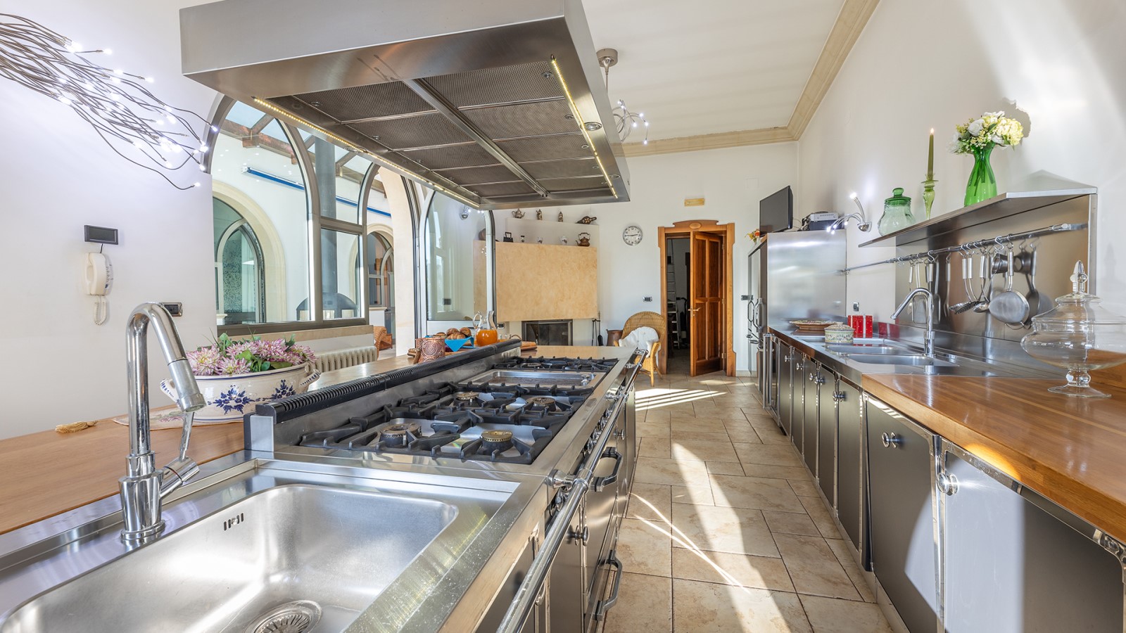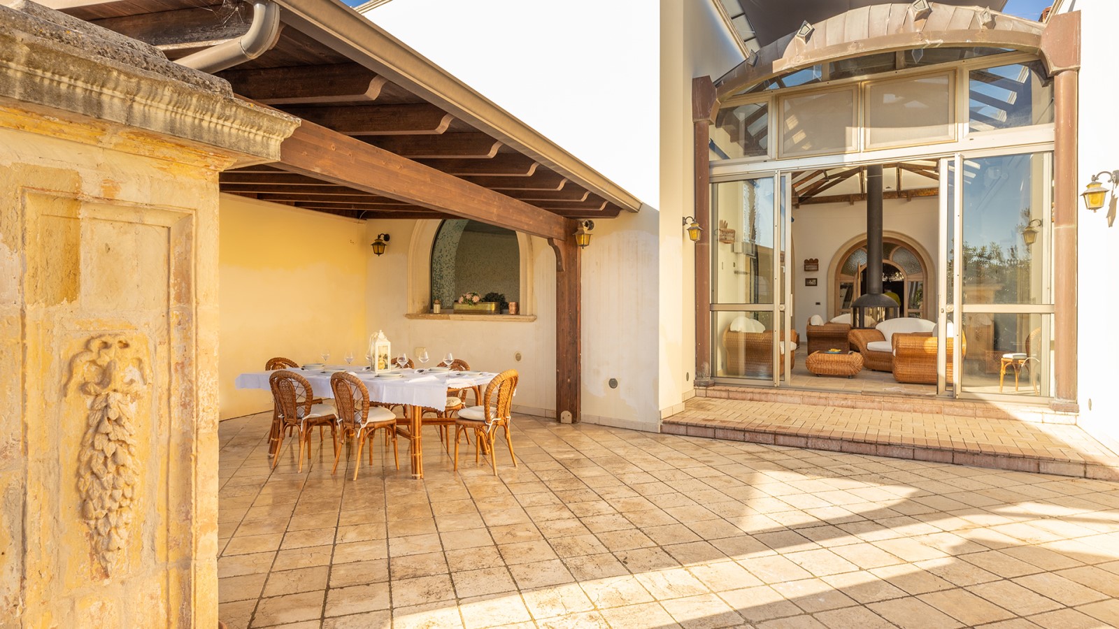 Dimora di charme con 4 camere matrimoniali, 3 bagni completi (2 ensuite), 1 bagno di servizio, ampio patio in vetro e rame, cucina professionale, zona relax con vasca idromassaggio e bagno turco. Arredi artigianali e mobili d’epoca convivono con elementi moderni e funzionali.