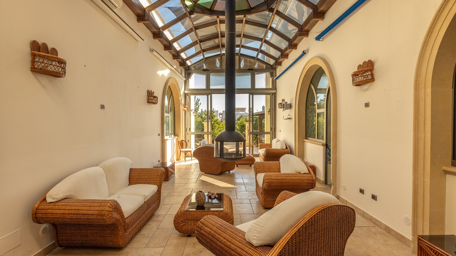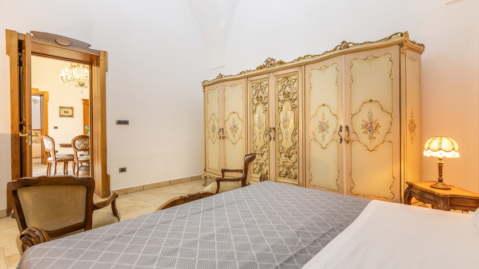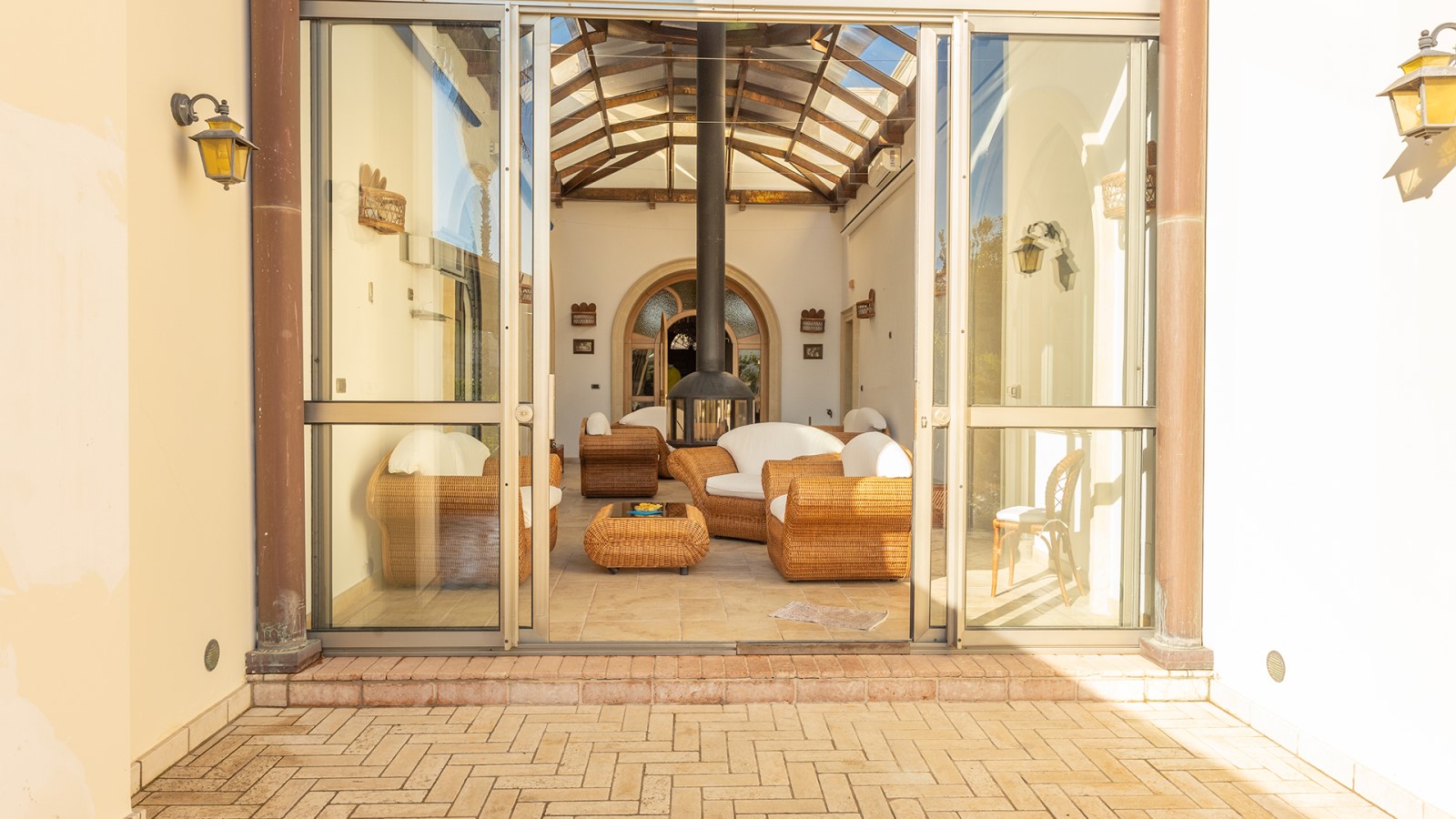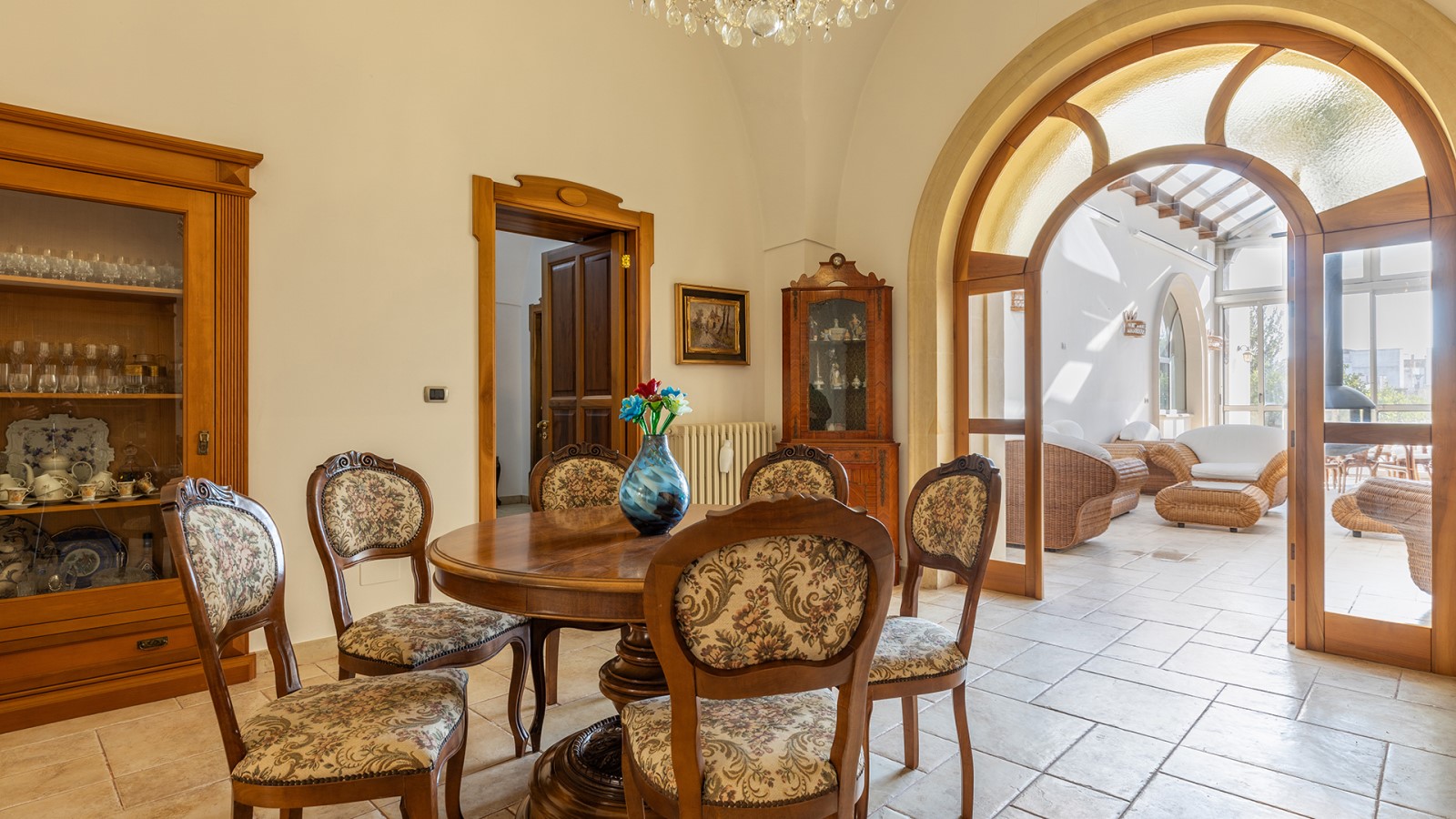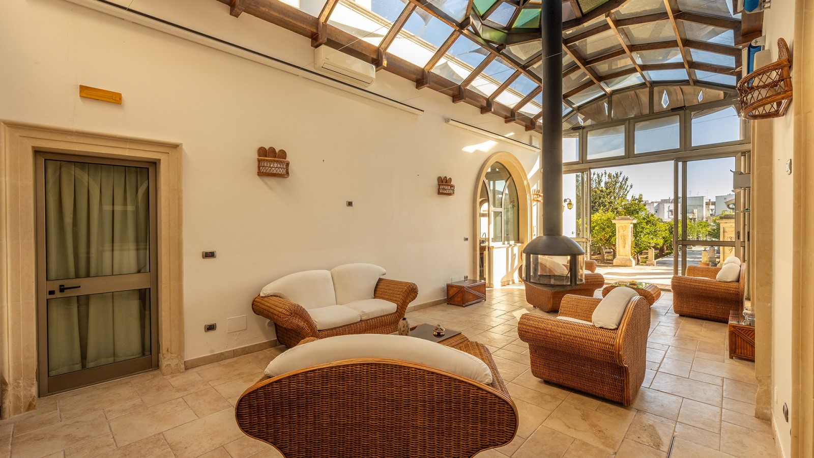 Dimora di charme con 4 camere matrimoniali, 3 bagni completi (2 ensuite), 1 bagno di servizio, ampio patio in vetro e rame, cucina professionale, zona relax con vasca idromassaggio e bagno turco. Arredi artigianali e mobili d’epoca convivono con elementi moderni e funzionali.
