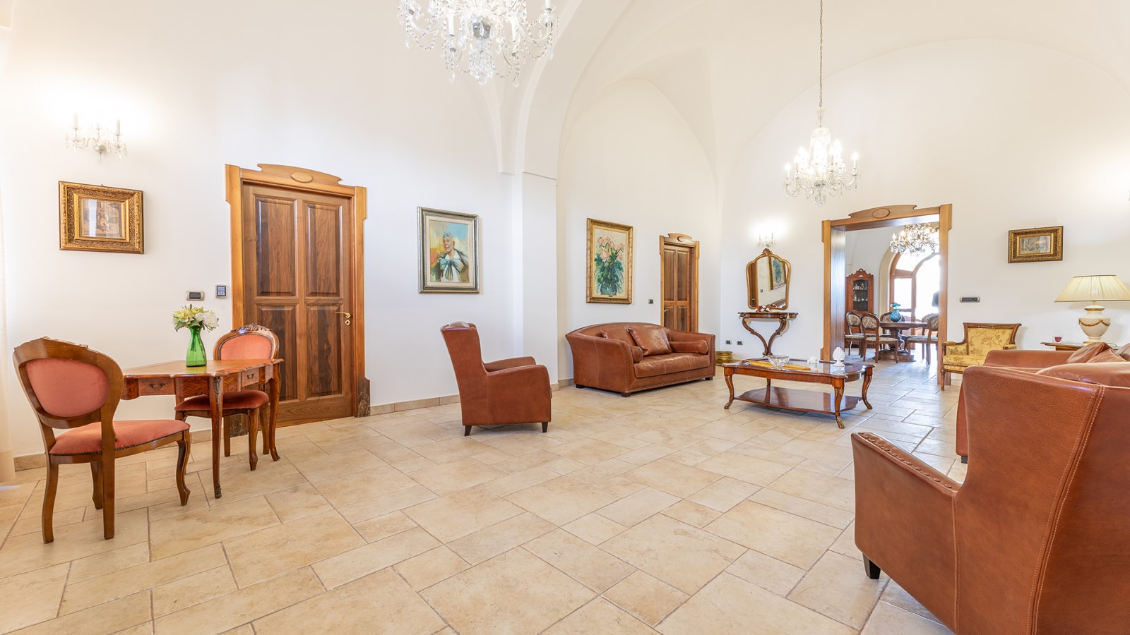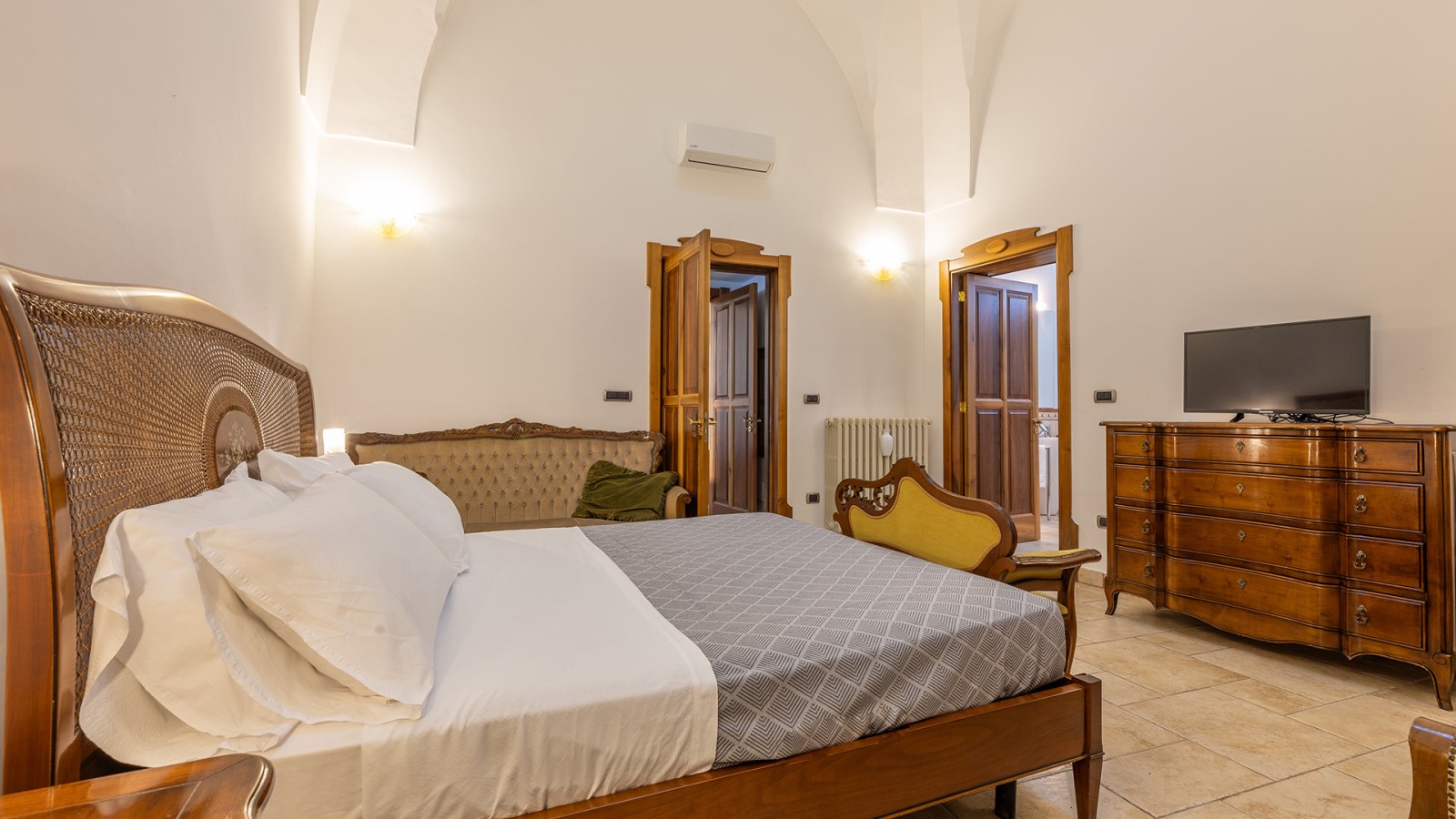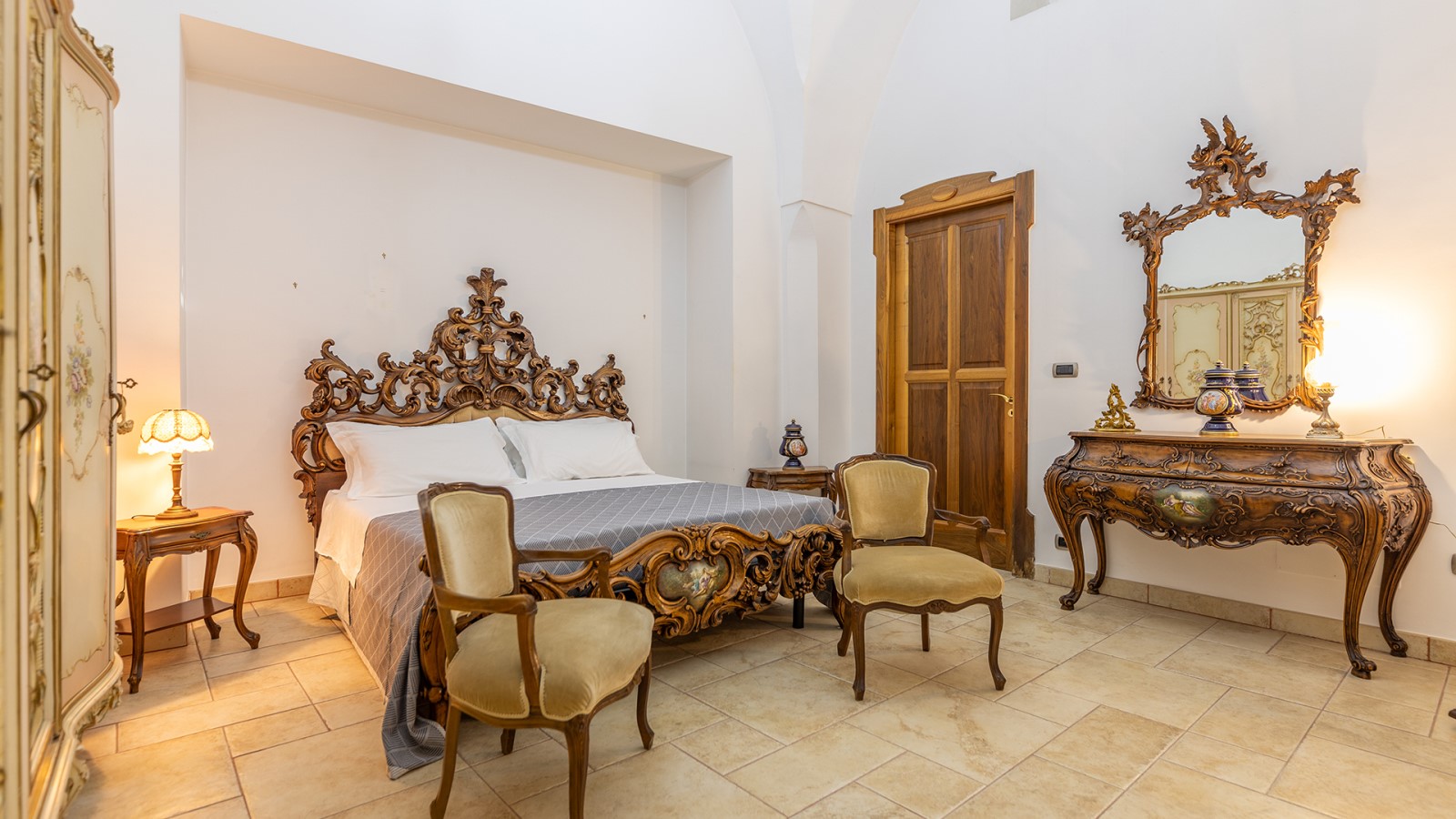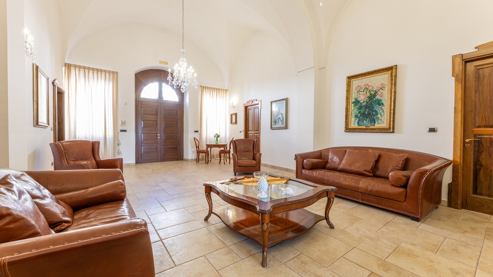 Dimora di charme con 4 camere matrimoniali, 3 bagni completi (2 ensuite), 1 bagno di servizio, ampio patio in vetro e rame, cucina professionale, zona relax con vasca idromassaggio e bagno turco. Arredi artigianali e mobili d’epoca convivono con elementi moderni e funzionali.