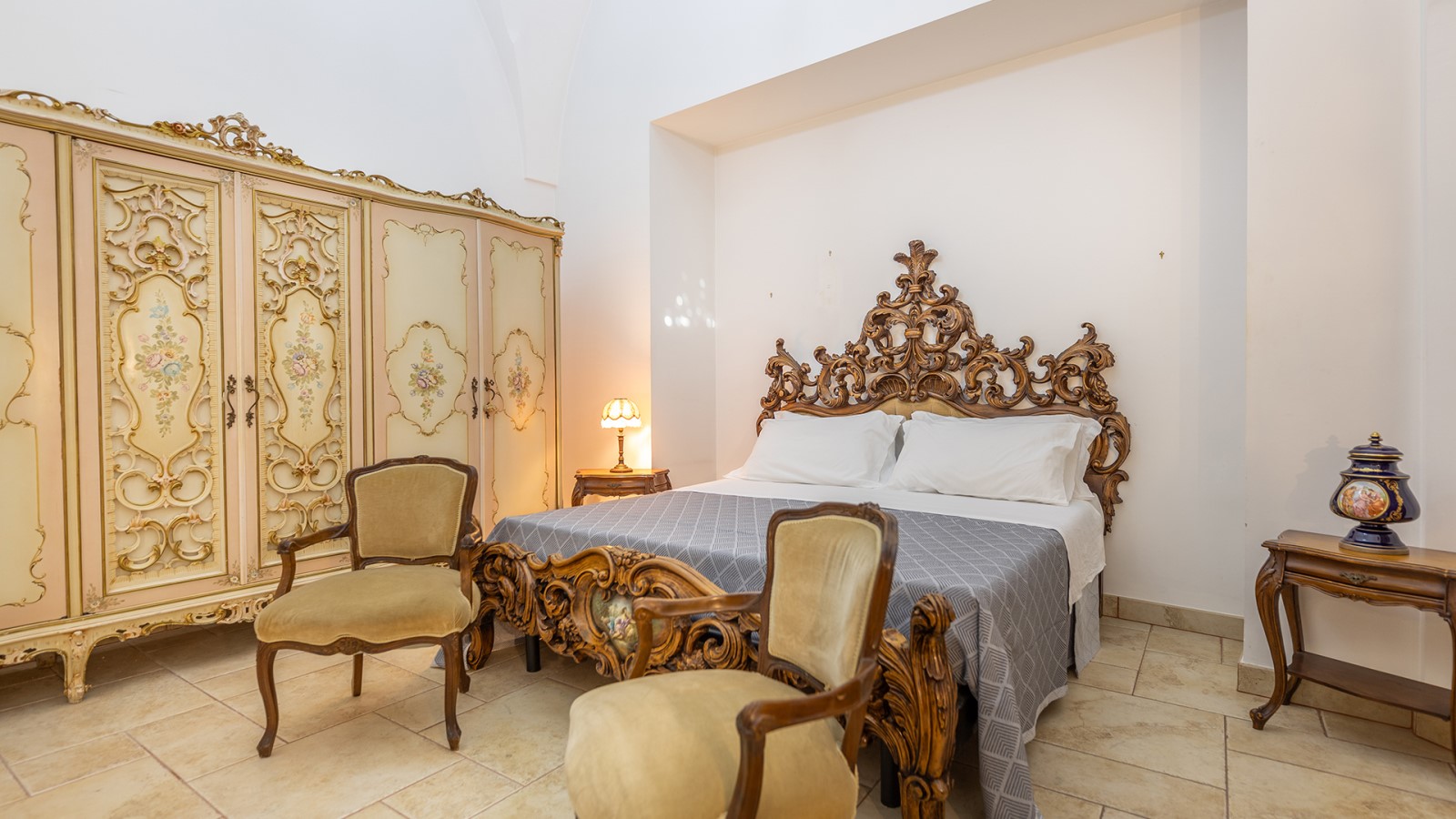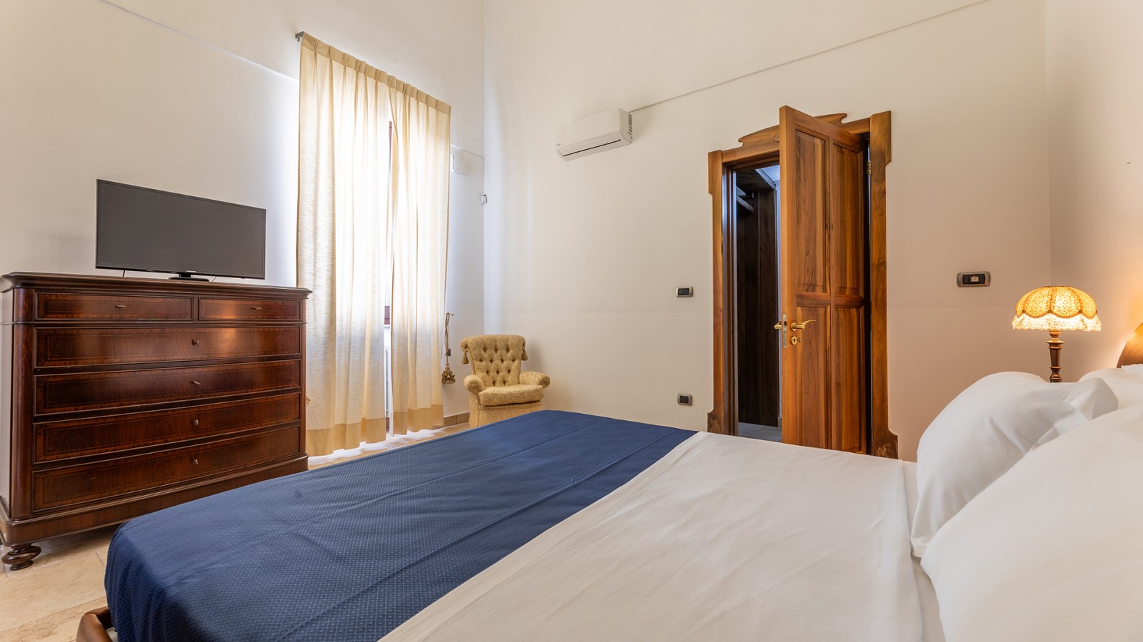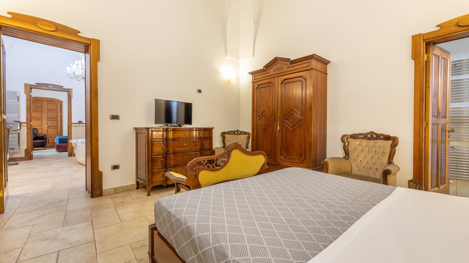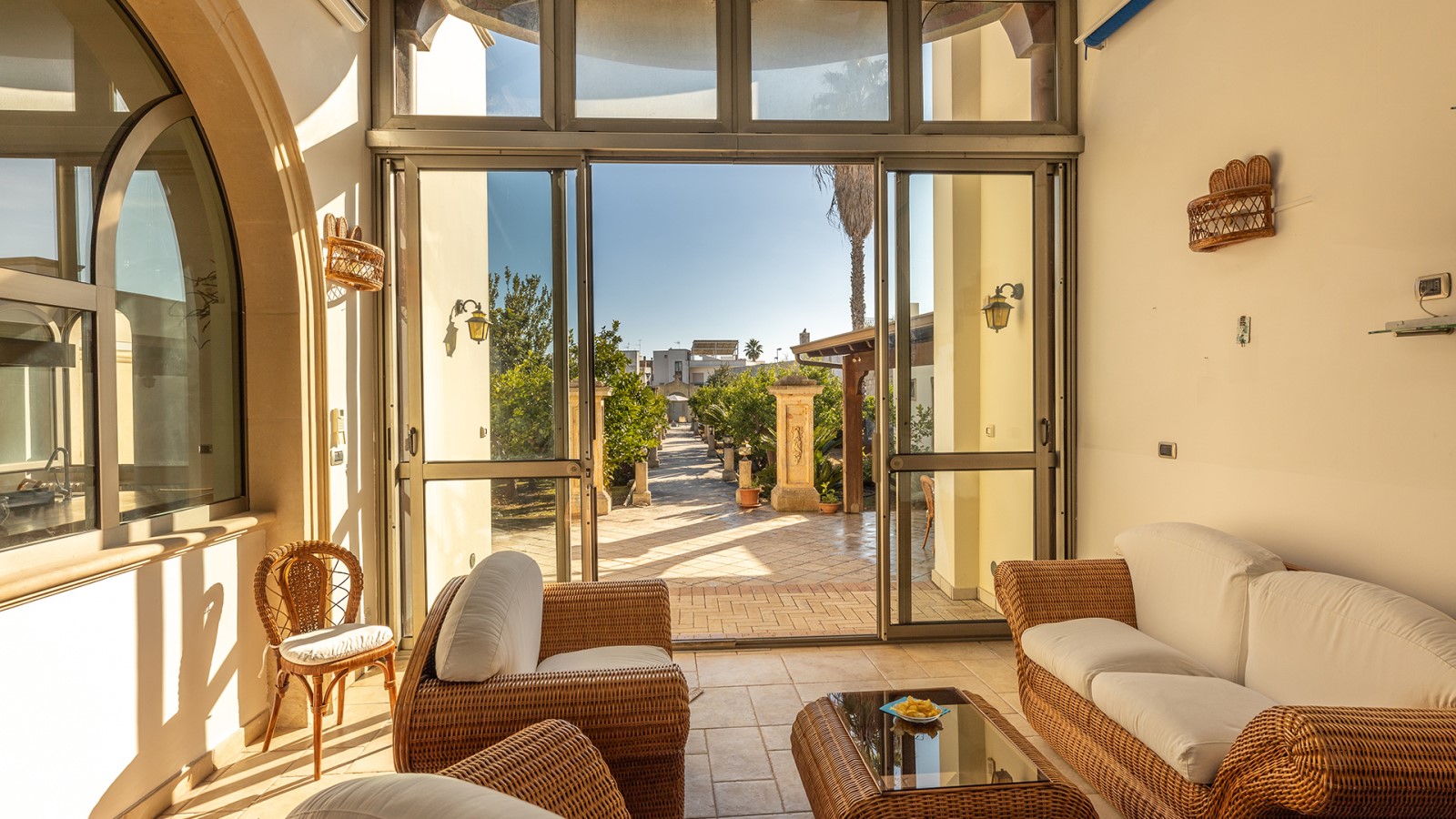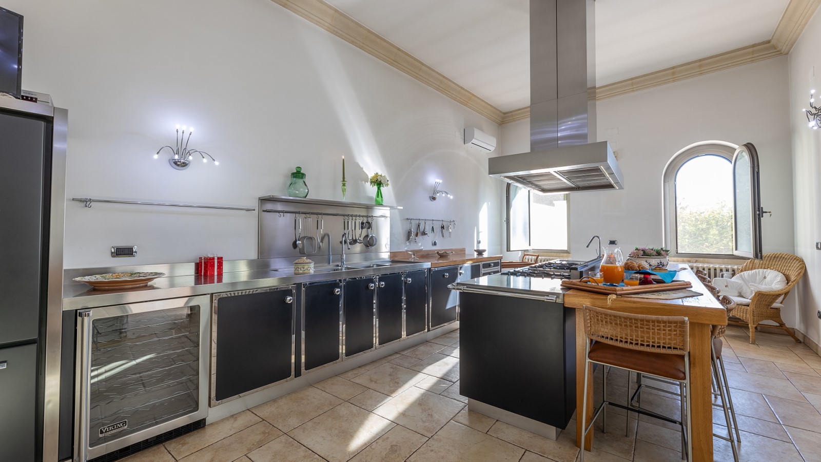 Dimora di charme con 4 camere matrimoniali, 3 bagni completi (2 ensuite), 1 bagno di servizio, ampio patio in vetro e rame, cucina professionale, zona relax con vasca idromassaggio e bagno turco. Arredi artigianali e mobili d’epoca convivono con elementi moderni e funzionali.