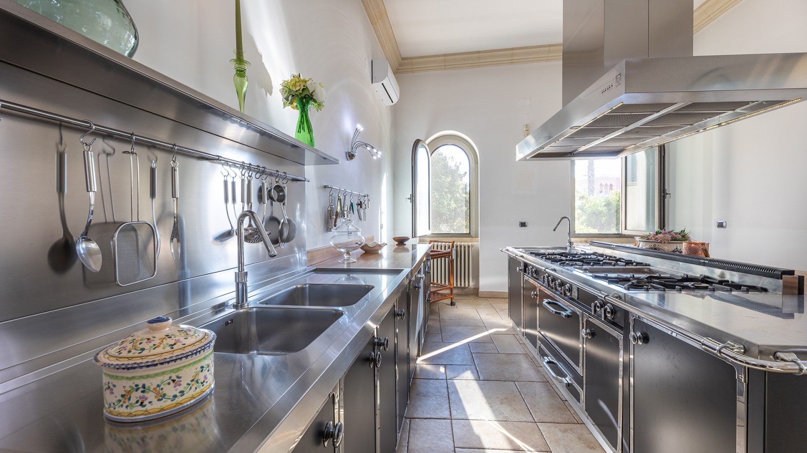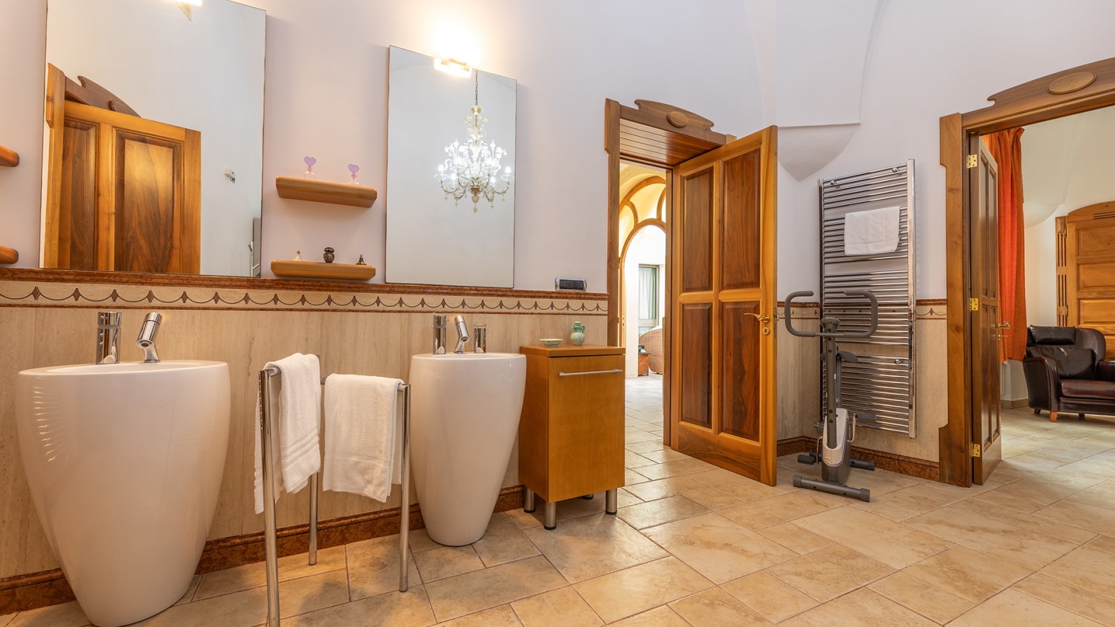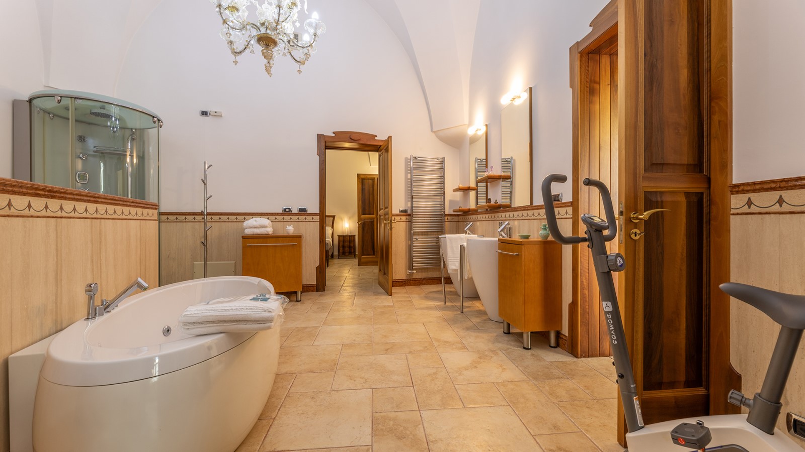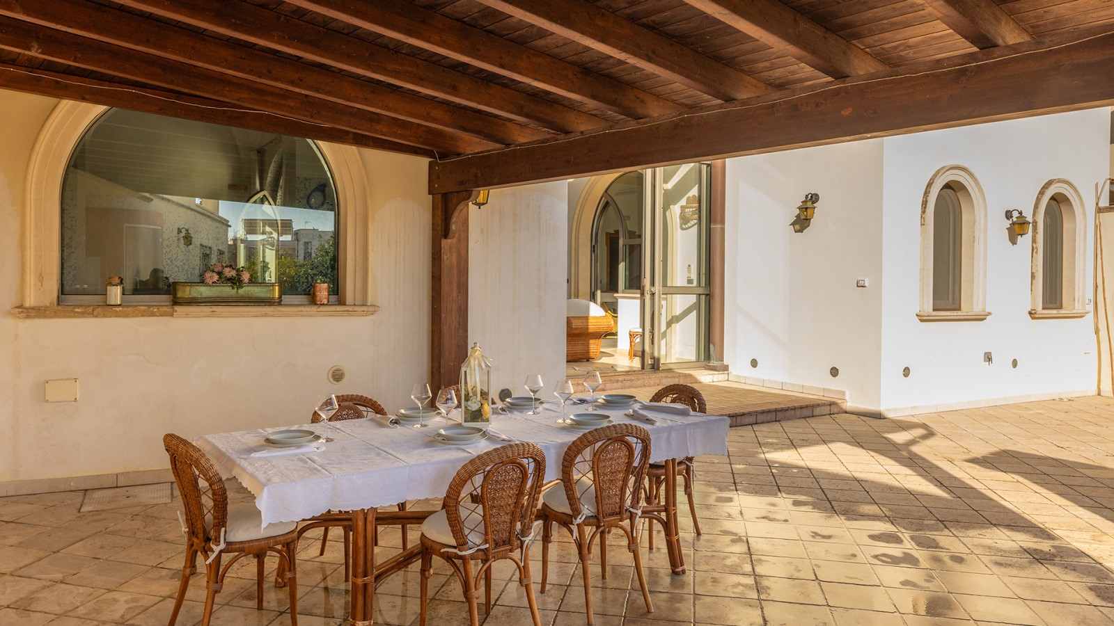 Dimora di charme con 4 camere matrimoniali, 3 bagni completi (2 ensuite), 1 bagno di servizio, ampio patio in vetro e rame, cucina professionale, zona relax con vasca idromassaggio e bagno turco. Arredi artigianali e mobili d’epoca convivono con elementi moderni e funzionali.