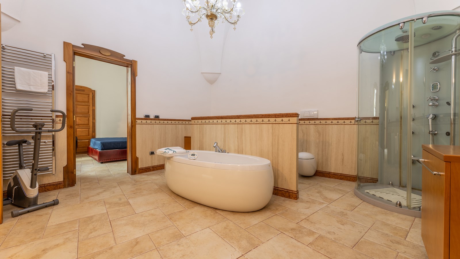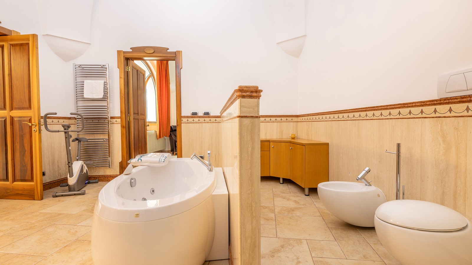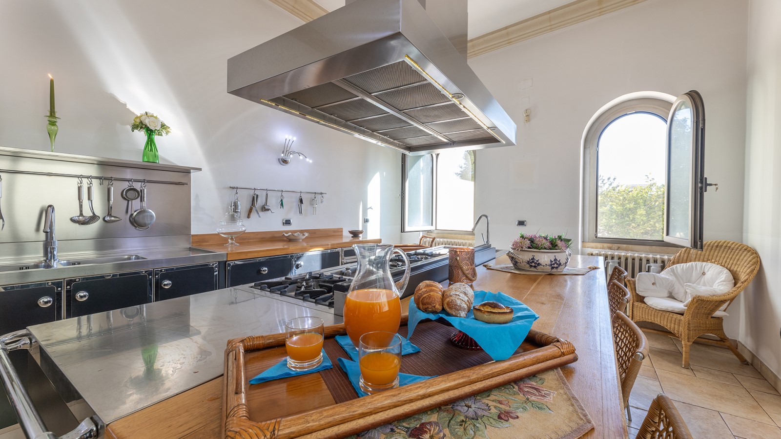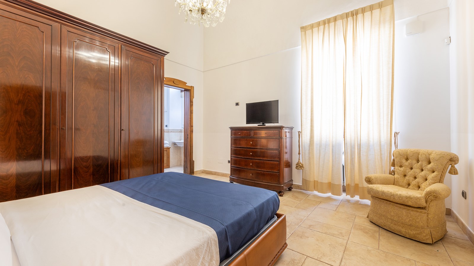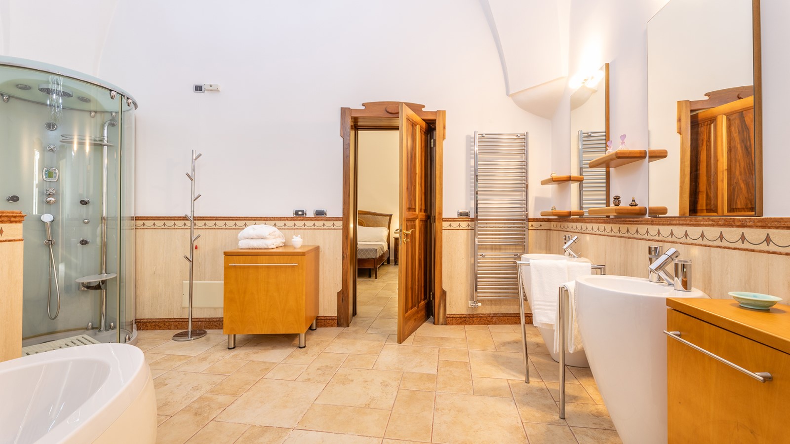 Dimora di charme con 4 camere matrimoniali, 3 bagni completi (2 ensuite), 1 bagno di servizio, ampio patio in vetro e rame, cucina professionale, zona relax con vasca idromassaggio e bagno turco. Arredi artigianali e mobili d’epoca convivono con elementi moderni e funzionali.