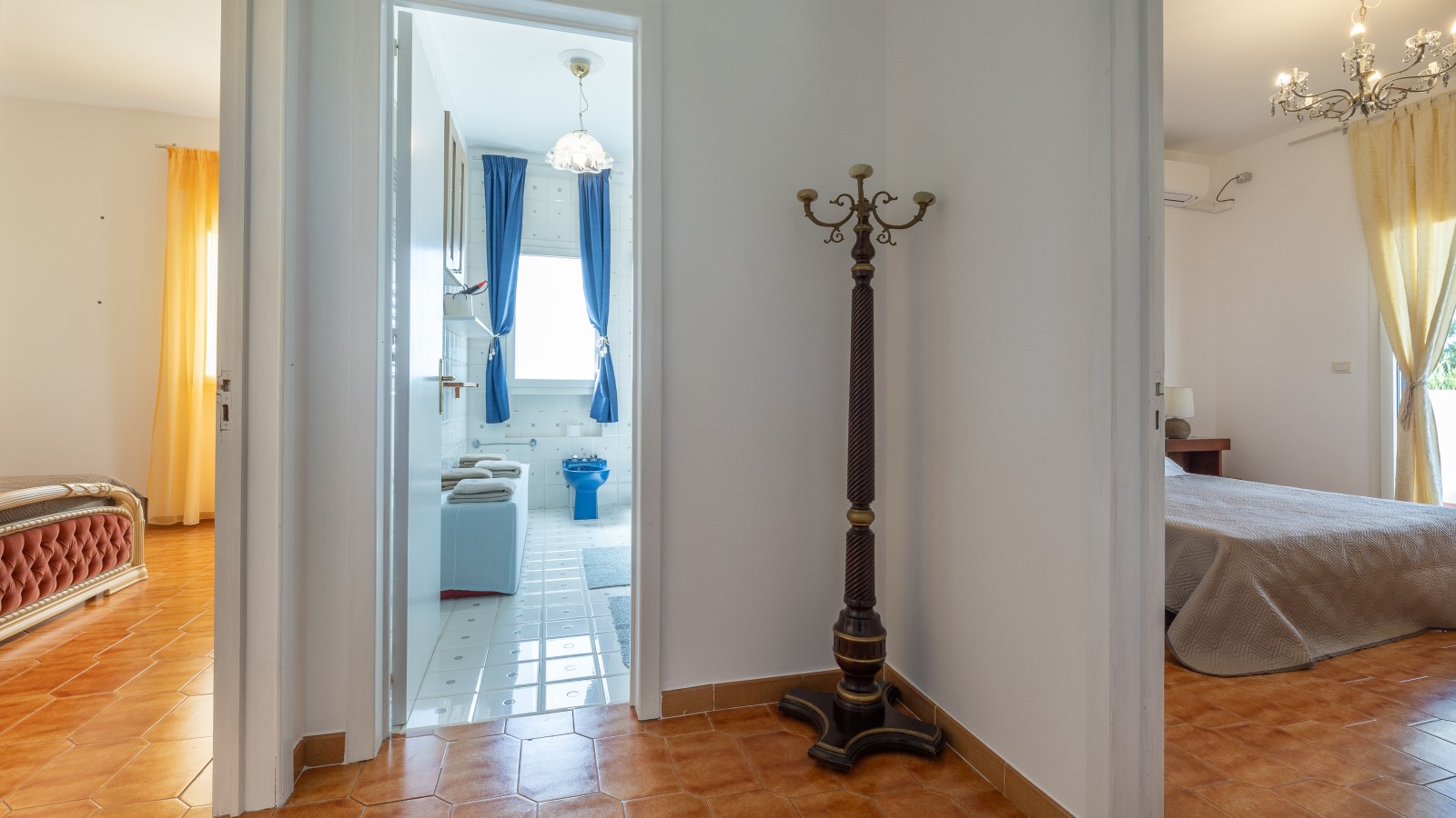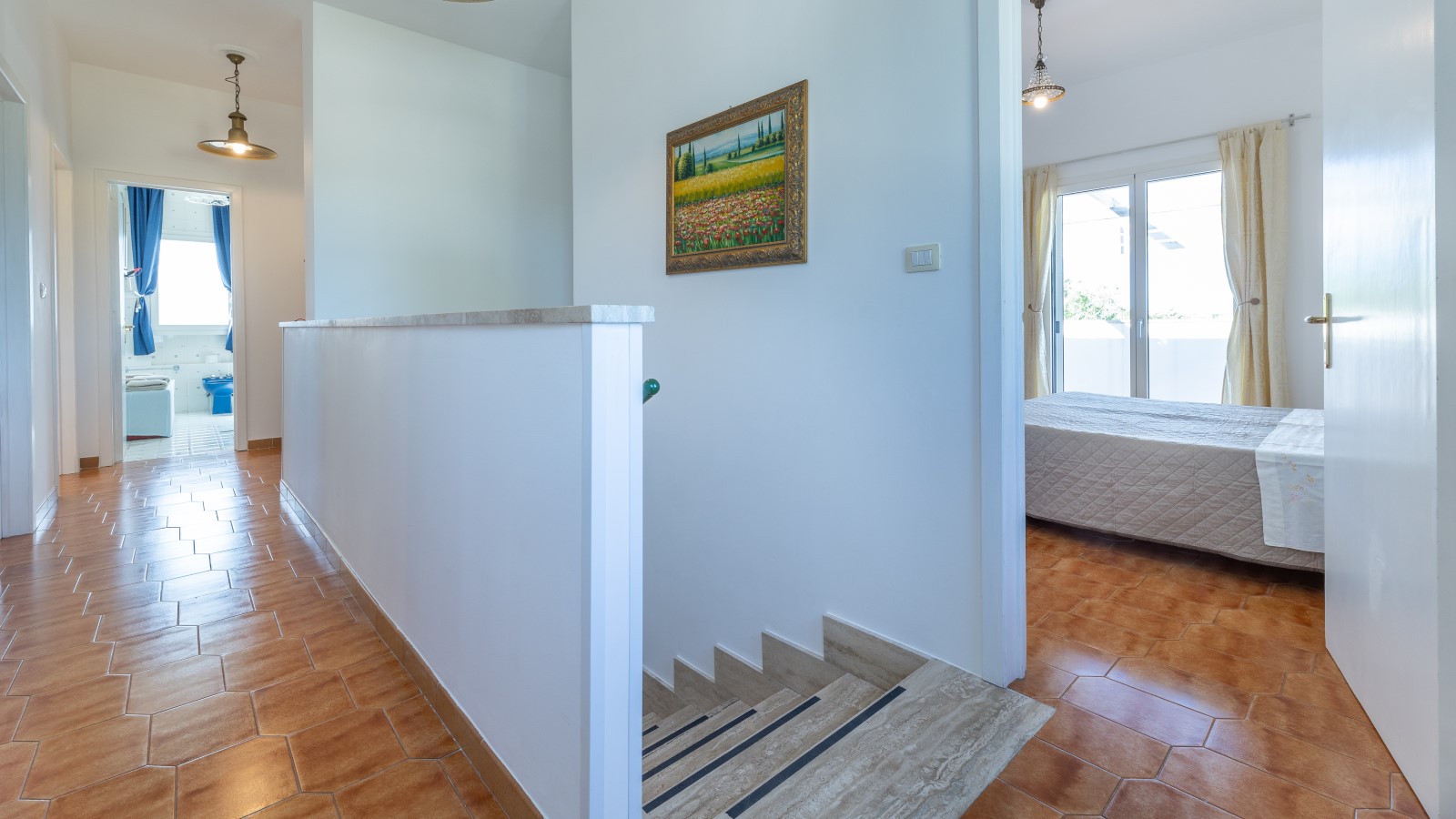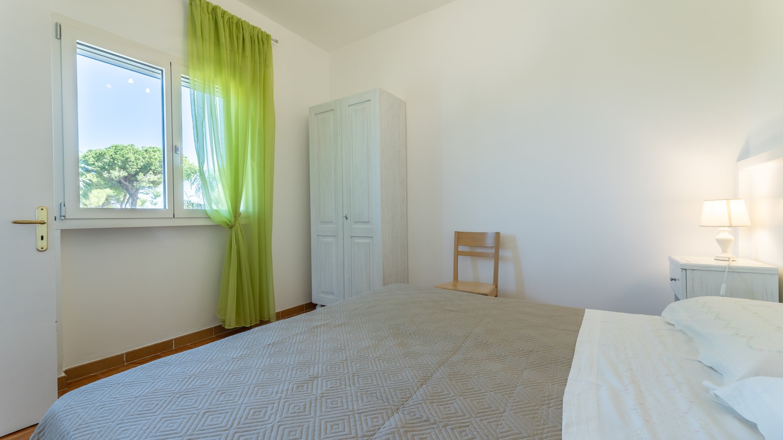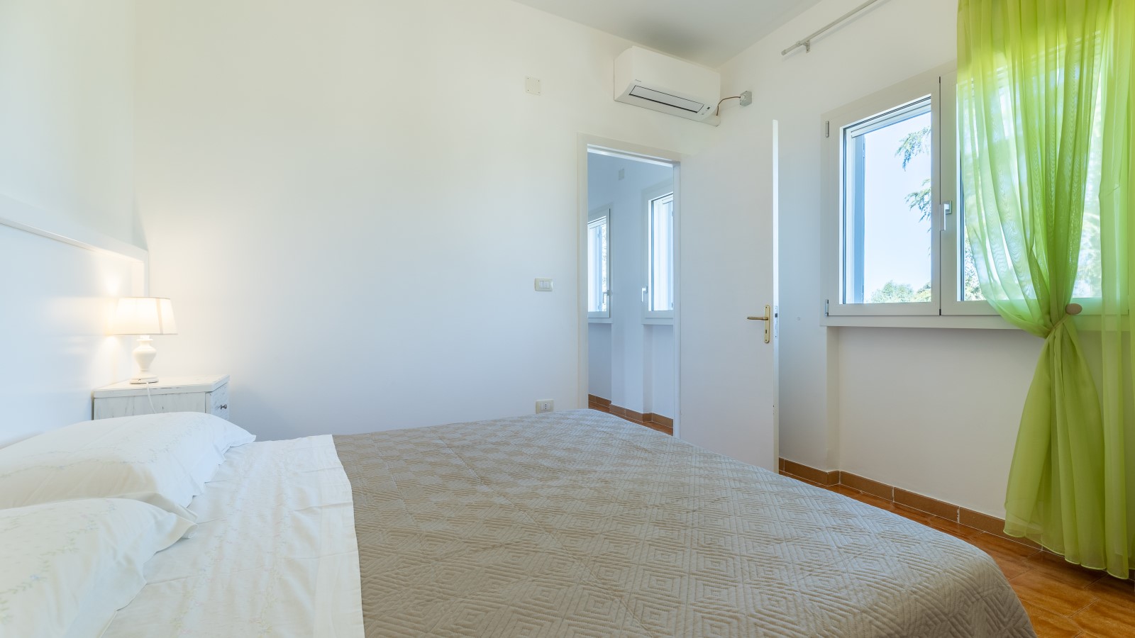 La villa si sviluppa su due livelli, con la zona notte al primo piano, dove sono presenti 4 camere da letto matrimoniali/doppie climatizzate e dotate di ampi balconi con vista sul giardino. Su richiesta, è possibile aggiungere un letto in due delle camere. Ci sono anche 2 bagni con box doccia e vasca.
